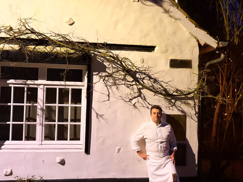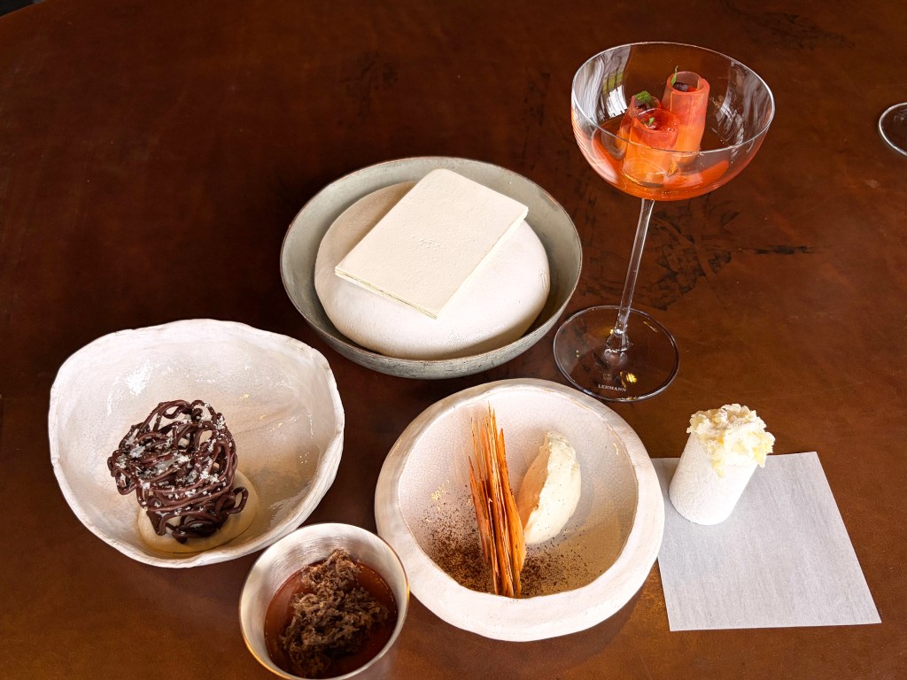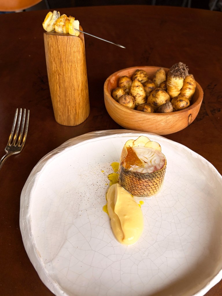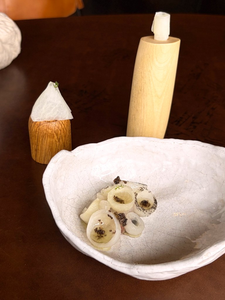La carotte pourpre et langoustine; Le blinis de lait entier et tourteau de nos côtes, lait entier des fermes de région, langue d’oursin pêché en mer du nord, servi sur une brioche beurrée; Radis noir et bouillon de navets fermenté, sublime !