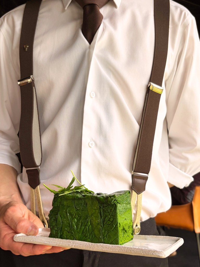 Terrine de feuilles, comme un pâté en croûte végétal, épinard, roquette sauvage comme un poivre végétal, la genoise, le flan, le tourteau comme un deuxième service, citron confit au sel cette fois ci, pressé de feuilles, les plus grandes pour enveloppé l’ensemble. Ajout de quelques gouttes de garum de homard, macération des carapaces séchées dans du vin blanc pendant plusieurs mois, réduit, dans le verre épinard fumé sous un voile de hareng et une aumônière d’épinard; Soufflé snacké langoustine et chlorophylle chaude, spectaculaire, unique ! Le Sandre et cerfeuille tubéreux, cuillère d’une acidité onctueuse, truffière, le gros bulot de la côte d’Opale.