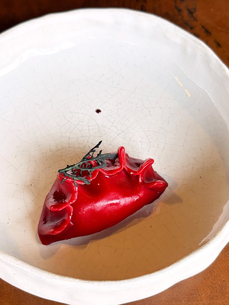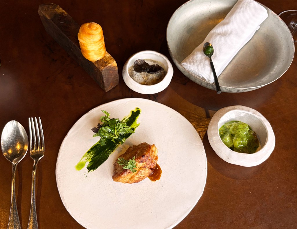 La raviole de betterave rouge, et son coeur coulant ! Le ris de veau croustillant, collagène de boeuf (tendon) en pastel fumé, galet de pommes boskoop à l’épinard, sous un bouquet d’herbes fraîches a trempé dans la sauce, gnocchis feuillet de boeuf et melanosporum, la cuillère légèrement picante, brioche feuilletée pour saucer le plat ! un Menu de haute volée, la perfection à la table de la Grenouillère